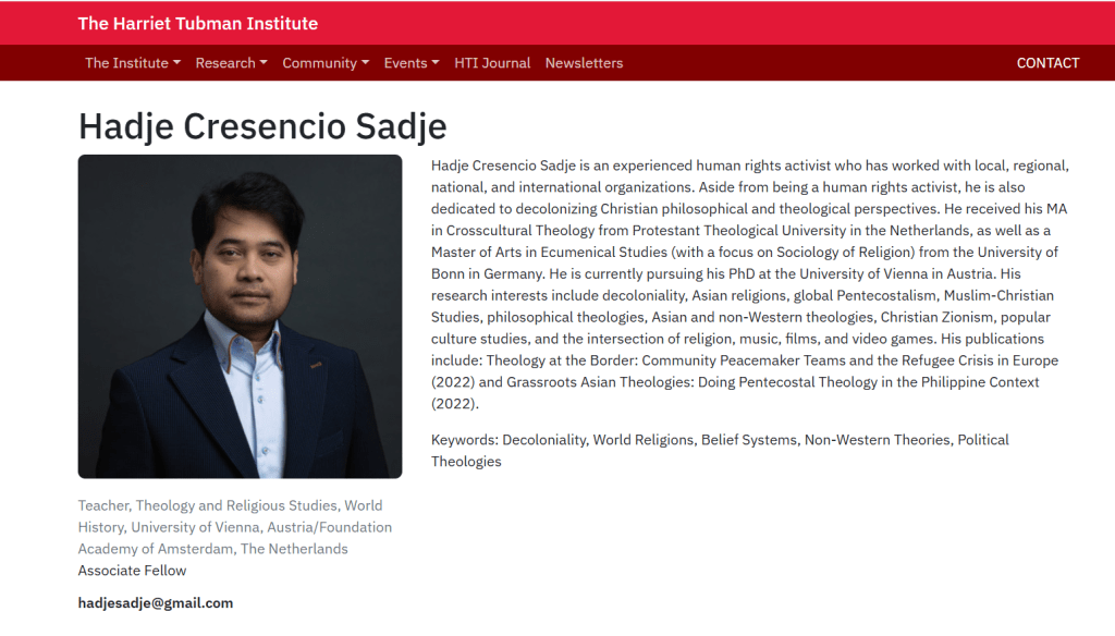 ● Associate Fellow, 2025—The Harriet Tubman Institute York University, Toronto, Canada, https://www.yorku.ca/research/tubman/profile/hadje-cresencio-sadje/