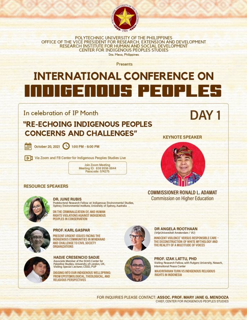 ● Speaker “Re-Echoing Indigenous Peoples Concerns and Challenges,” (20, October 2021) IP Conference Polytechnic University of the Philippines Sta. Mesa, Manila, Philippines