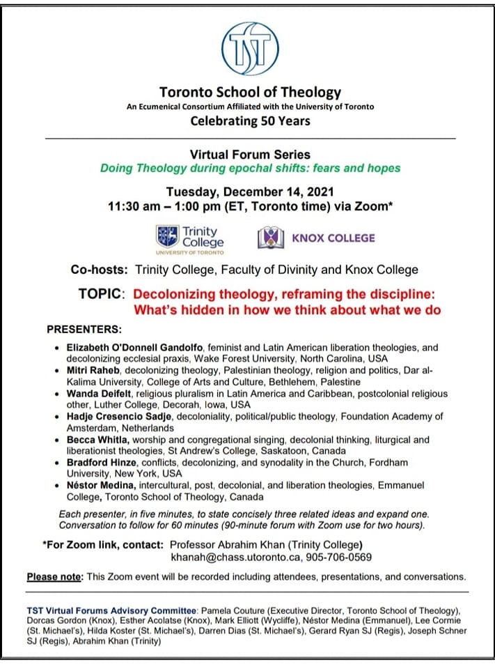 ● Speaker “Decolonizing theology, reframing the discipline: What’s hidden in how we think about what we do?,” (14, December 2021), Toronto School of Theology, An Ecumenical Consortium Affiliated with the University of Toronto, Celebrating 50 Years, Virtual Forum Series, Doing Theology during epochal shifts: fears and hopes, Canada