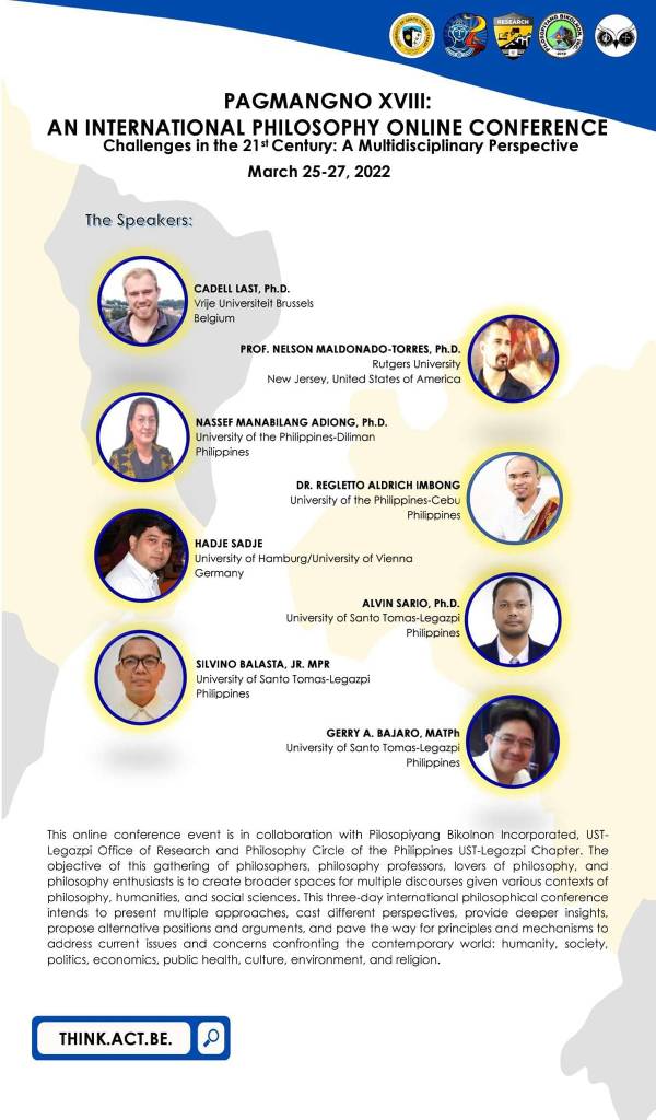 ● Speaker “Global Challenges in the 21st Century Philosophy: A Multidisciplinary Perspective,” (25-27, March 2022) PANGMANGNO XVIII, An International Conference Online, UST Legazpi, Philippines