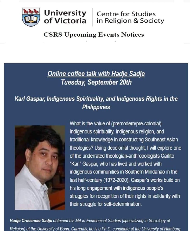 ● Speaker “Karl Gaspar, Indigenous Spirituality, and Indigenous Rights in the Philippines,” (20, September 2022) Centre for Studies in Religion and Society – University of Victoria Canada