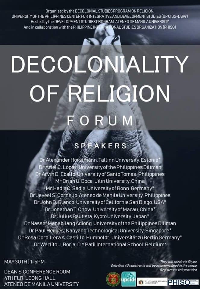 ● Resource Speaker “Decoloniality of Religion,” (30, May 2019) Forum organized by the Decolonial Studies Program on Religion of the UP Center for Integrative and Development Studies (UPCIDS-DSPr) and hosted by the Development Studies Program of Ateneo de Manila University, Philippines