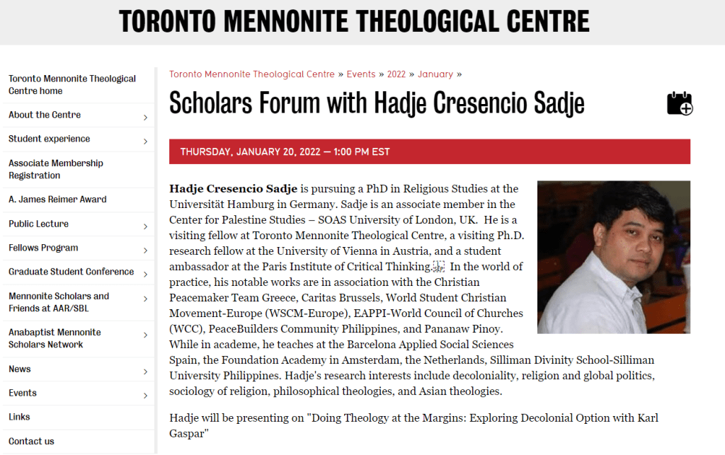 ● Speaker “Doing Theology at the Margins: Exploring Decolonial Option with Karl Gaspar” (20, January 2022) Scholar Forum hosted by Toronto Mennonite Theological Centre-Conrad Grebel University College affiliated with the Toronto School of Theology at the University of Toronto, Canada