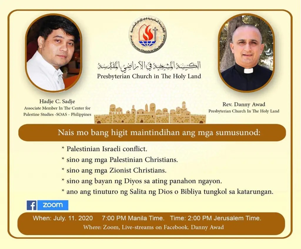 ● Speaker “Pagusapan po natin ang mga isyung tulad ng Israel at Palestinian Conflict, sino ang mga Palestinian Christians, sino ang mga Zionist Christians, at iba pa.” (11, July, 2020) Rev. Ptr. Danny Awad (isang Palestinian Christian mula sa Bethlehem, West Bank).