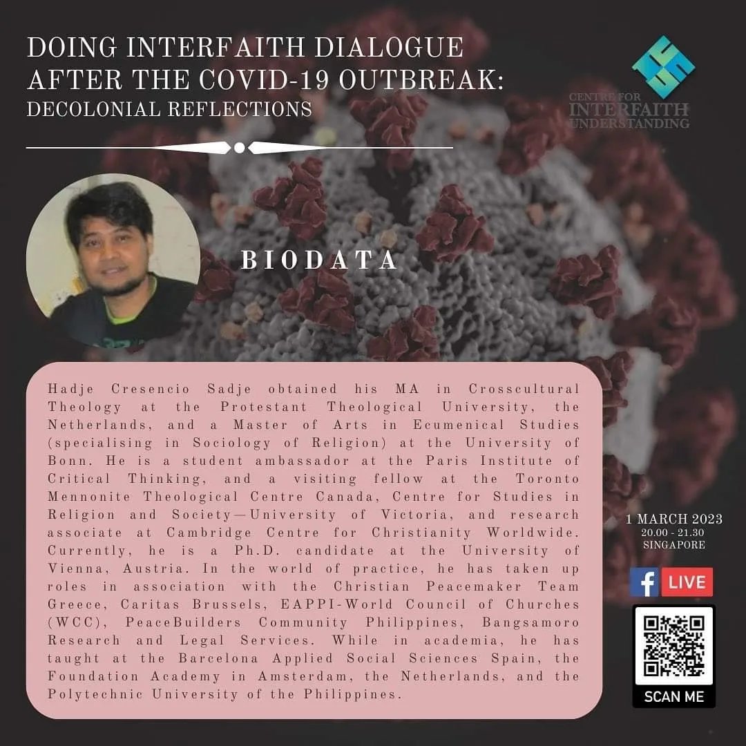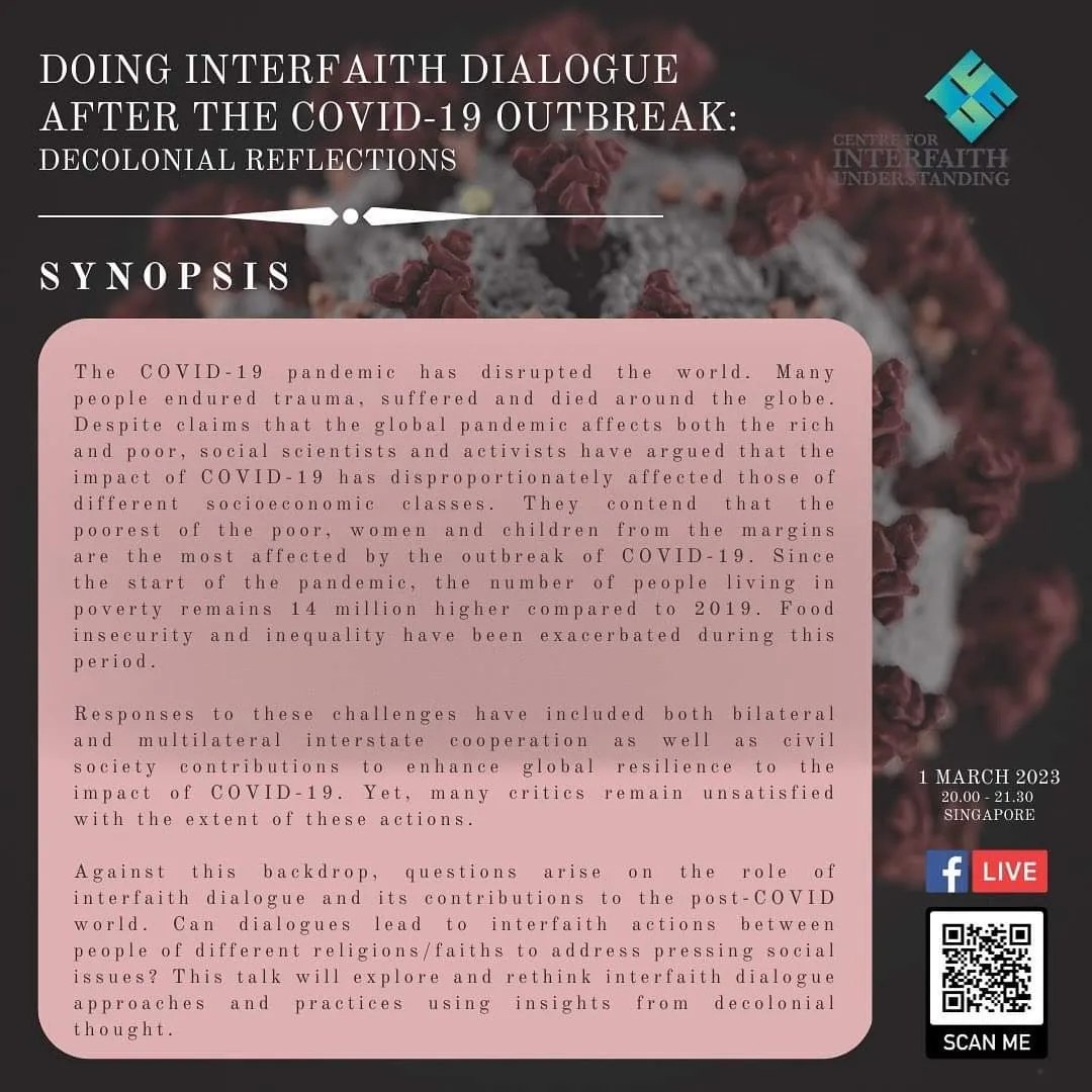 ● Speaker “Doing Interfaith Dialogue after the Covid-19 Outbreak: Decolonial Reflections” (01, March 2023) Moderated by Dr. Victor Gan (Center for Interfaith Understanding), Singapore