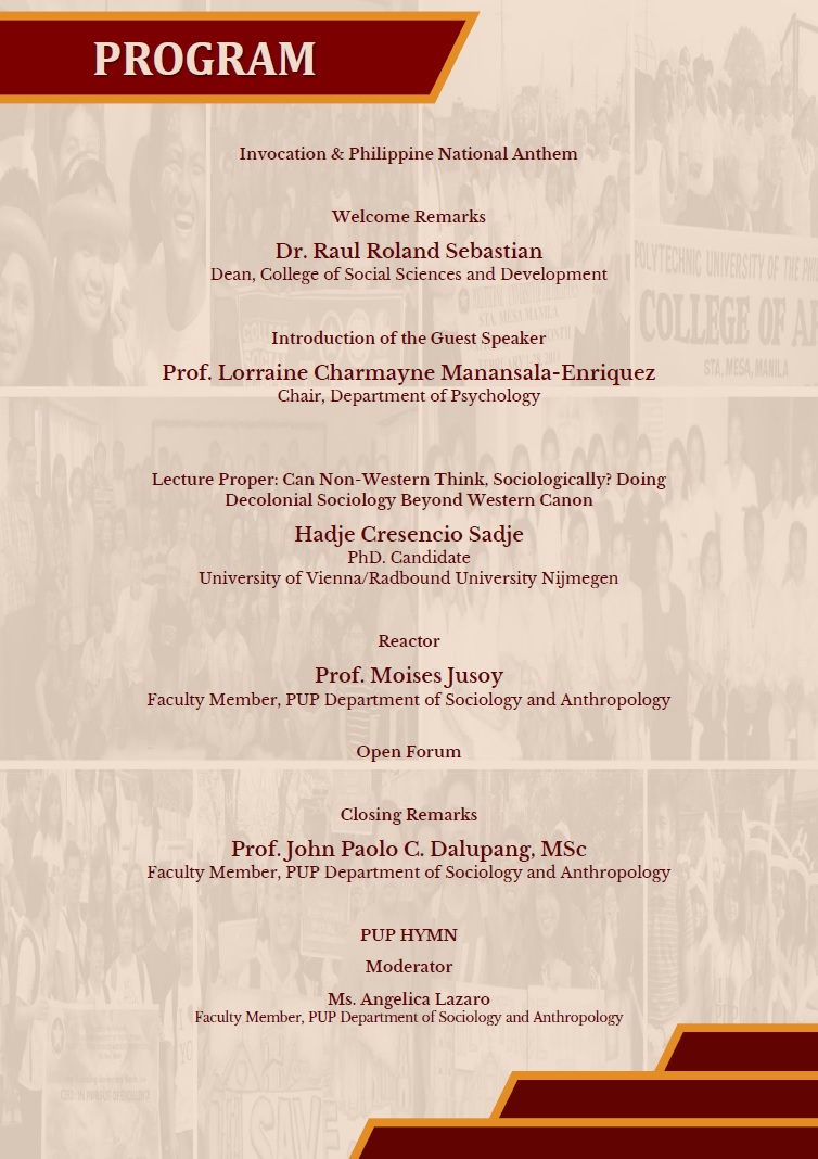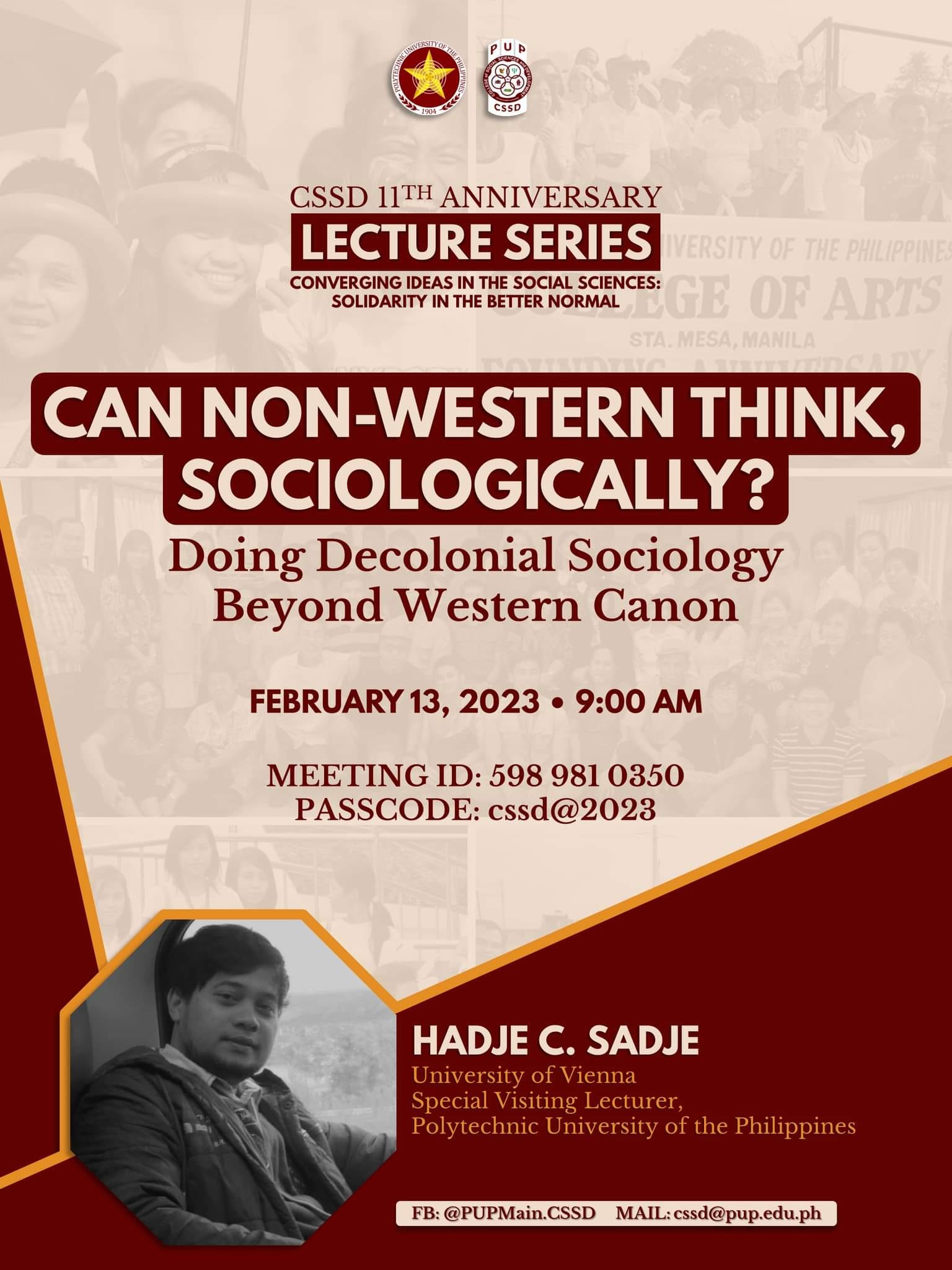 ● Speaker “Can Non-Western Think, Sociologically? Doing Decolonial Sociology Beyond Western Canon,” (13, February 2023) The first lecture of the Collegue of Social Sciences and Development’s 11th Anniversary Lecture Series, Polytechnic University of the Philippines Manila