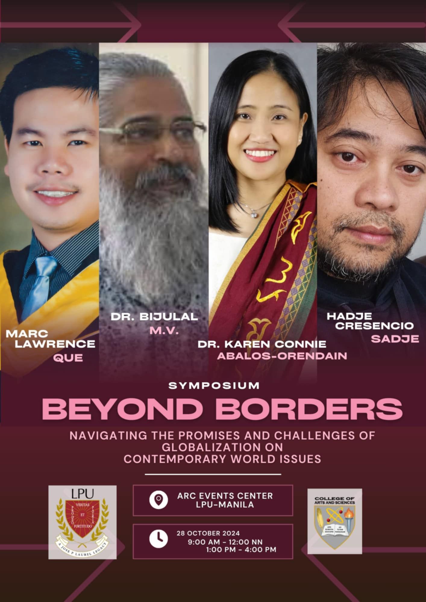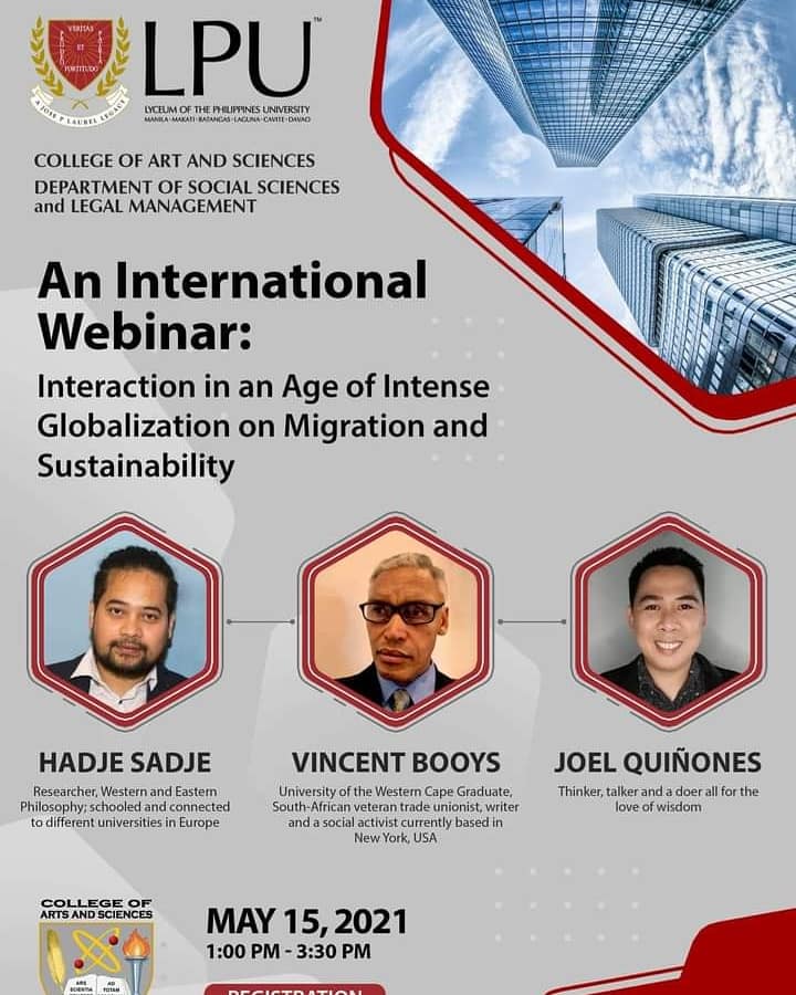 ● Speaker “Interaction in an Age of Intense Globalization on Migration and Sustainability” (May 15, 2021). An International Webinar. College of Art and Social Sciences, Department of Social Sciences and Legal Management, Lyceum University of the Philippines