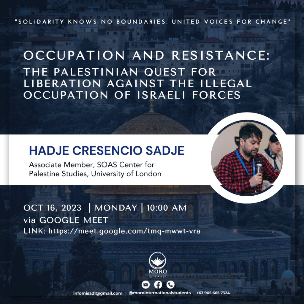 ● Speaker “Occupation and Resistance: The Palestinian quest for Liberation against the Illegal occupation of Israeli Forces,” The Moro International Student Association,Inc., Philippines
