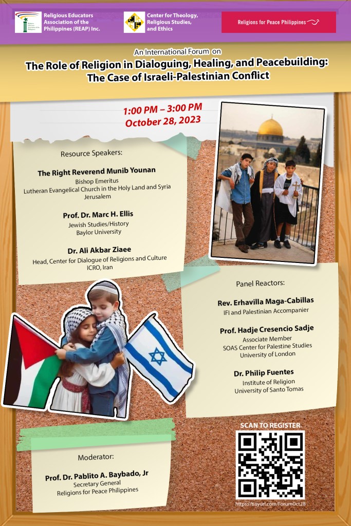 ● Reactor “The Role of Religion in Dialoguing, Healing, and Peacebuilding: The Case of Israeli – Palestinian Conflict,” Hosted by The Religious Educators Association of the Philippines (REAP), Inc.; the University of Santo Tomas Center for Theology, Religious Studies, and Ethics (CTRSE); and Religions for Peace Philippines