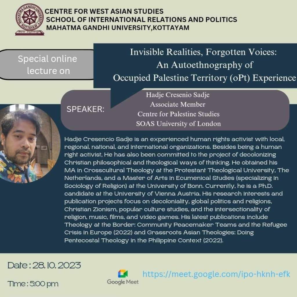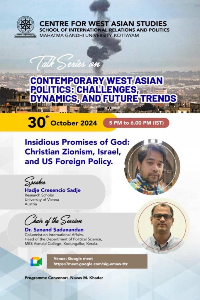 ● Speaker “Insidious Promises of God: Christian Zionism, Israel, and US Foreign Policy,” hosted by Centre for West Asian Studies School of International Relations and Politics, Mahatma Gandhi University, Kottayam