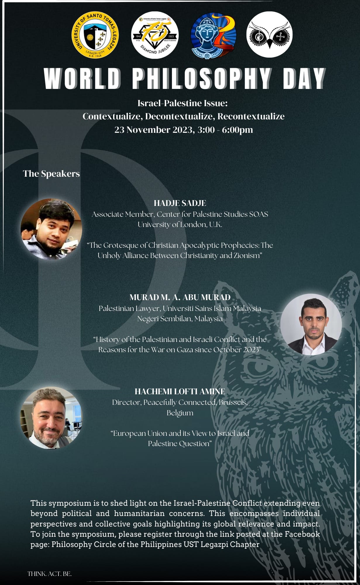 ● Speaker “The Grotesque of Christian Apocalyptic Prophecies : The Unholy Alliance Between Christianity and Zionism,” Contextualize, Decontextualize, Recontextualize/World Philosophy Day organized by Philosophy Ciricle of the Philippines, University of Santo Tomas Legazpi, Philippines